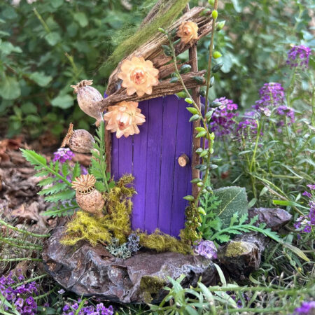 This enchanting fairy garden features a handcrafted purple door framed with twigs, moss, and tiny blossoms. Set against a backdrop of greenery and nestled among delicate purple flowers, it creates the illusion of a magical entryway into a hidden world. The rustic details, from dried seed pods to trailing vines, add charm and a sense of wonder to any outdoor space – Source: @the.fairy.folk.shoppe