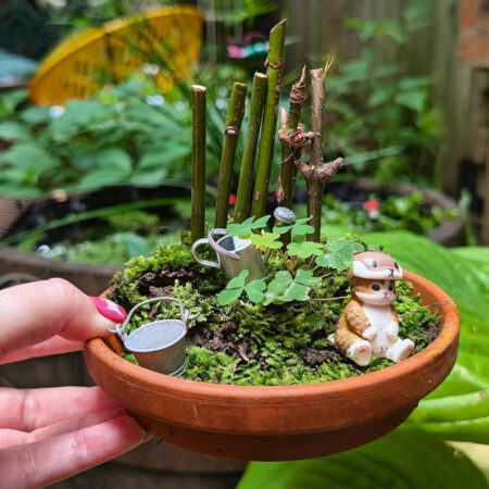 A playful fairy garden scene is arranged in a shallow terracotta dish, complete with moss, clover, and bamboo-like sticks. Tiny watering cans and a small cat figurine add charm, making it feel like a magical little world in your hands Source: @montrealgarden
