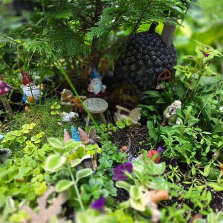 ddddThis lush fairy garden is alive with detail, featuring a pinecone-shaped fairy house nestled among greenery and moss. Tiny gnome figurines, mushrooms, and a miniature table create a playful woodland village setting. The abundance of plants and natural textures makes it feel like a secret world hidden within the garden – Source: @cjspataro