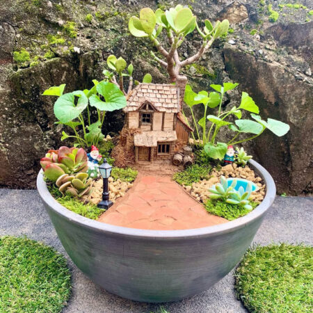 A charming fairy garden set in a round container, complete with a rustic miniature house, tiny gnomes, succulents, and a pebble-lined path. Lush greenery and playful details like a lamppost and small water feature make it feel like a magical world in miniature – Source: @moss_grows_fat