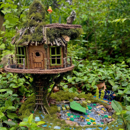 6. Enchanted treehouse fairy garden with woodland pond