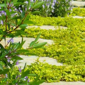 With bright green foliage and cheerful yellow flowers, creeping Jenny rapidly fills spaces between pavers. It thrives in moist, partially shaded areas and tolerates limited foot traffic, providing vibrant color and lush growth.