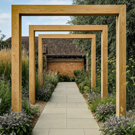 6. Framed garden walkway with modern timber structures