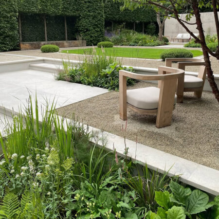 5. Modern garden seating with layered planting and clean lines