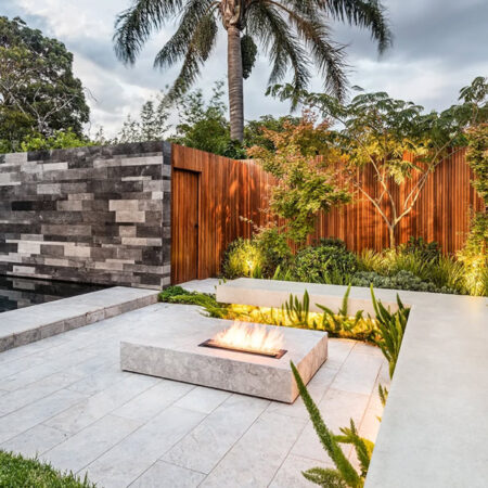 This modern garden design uses a built-in fire feature as a strong focal point, anchoring the space and encouraging year-round outdoor use. Clean stone paving and structured seating create a sleek, architectural feel, while layered planting and warm timber fencing soften the hard lines. Subtle garden lighting adds depth and atmosphere, turning the courtyard into an inviting extension of the home after dark – Photo: @signature_landscapes