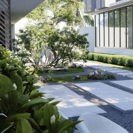 4. Contemporary courtyard with layered greenery and stone paths