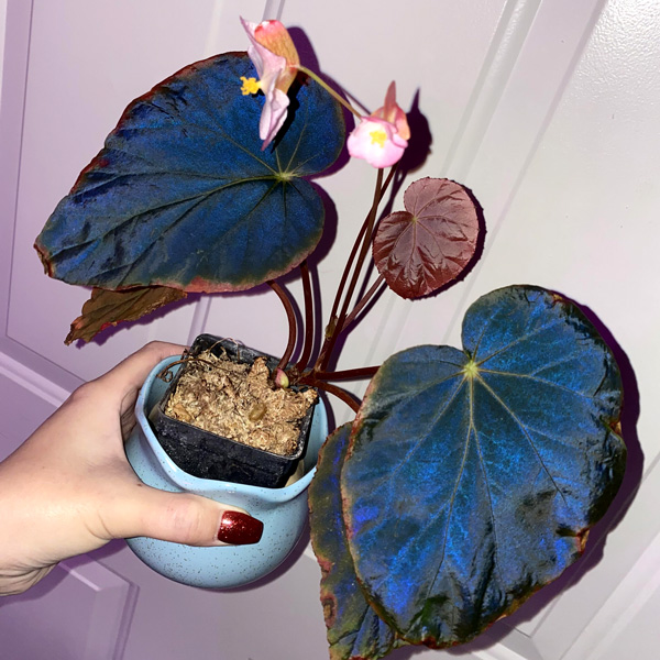 Begonia pavonina is known for its blue-green iridescent leaves that shimmer under light. It prefers consistently moist soil and gentle, filtered light to highlight its unusual color. In low light, its foliage may appear darker, but the shimmering effect will return with brighter conditions.