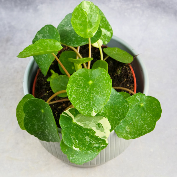 A variegated version of the popular Chinese money plant, this pilea shows creamy marbling across its round leaves. It enjoys bright, filtered light and well-drained soil. Rotate the plant occasionally so it grows evenly toward the light.