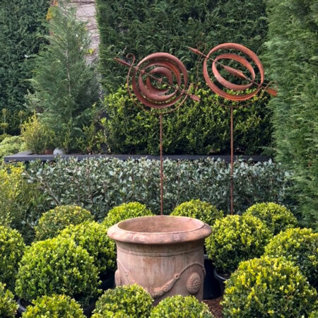 Rustic metal spiral garden stakes add sculptural interest to this formal planting, rising above clipped evergreen shrubs with a warm, weathered finish. The simple metal forms contrast beautifully with the lush greenery, showing how rustic metal garden decorations can bring height, texture, and visual balance to structured garden designs – Photo: @harolds_finishing_touches