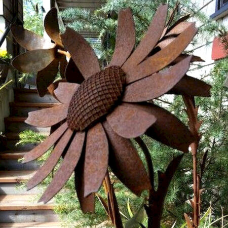 A tall rustic metal flower garden stake adds height and personality to this planted corner, with layered metal petals and a rich, weathered patina that blends naturally into the surrounding greenery. Positioned among ornamental grasses and shrubs, this rustic metal garden decoration creates a strong vertical accent while reinforcing an earthy, handcrafted look that feels timeless rather than decorative for decoration’s sake.