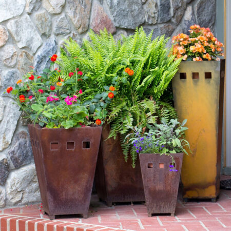 These tall rustic metal planters showcase the beauty of weathered steel, with warm tones that complement stone walls and brick paving. Filled with lush ferns and colourful seasonal blooms, they demonstrate how rustic metal garden decorations can soften entryways while adding height, texture, and a handcrafted feel to patios and front doors – Photo: @PrairieDanceStudio