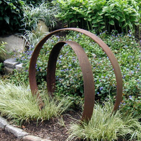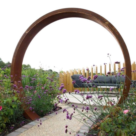 This oversized rusted steel ring creates a striking focal point at the end of a garden path, blending modern form with rustic character. Surrounded by soft planting and flowering perennials, the circular frame draws the eye forward and adds structure without overpowering the natural setting, making it a bold yet harmonious rustic metal garden decoration.