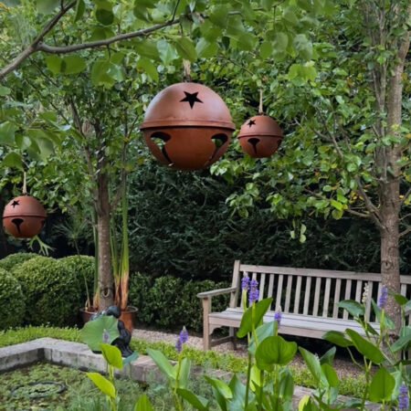 Rustic metal hanging garden lanterns add depth and atmosphere to this leafy garden setting, with their weathered finish blending naturally into the surrounding greenery. Suspended from tree branches, these rustic metal garden decorations introduce soft structure and visual interest above the planting, helping create a calm, layered space that feels inviting both during the day and after dusk – Photo: @harolds_finishing_touches