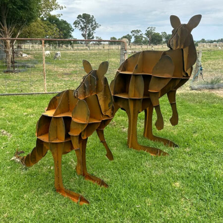 These rustic metal kangaroo sculptures bring character and movement to an open garden or rural landscape, with their weathered steel finish developing a rich, natural patina over time. The layered metal construction adds texture and depth, making them standout rustic metal garden decorations that suit large lawns, country properties, or statement feature areas with space to let them shine – Photo: @oldndazedwagga