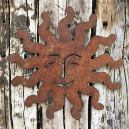 A rustic metal sun wall art piece brings warmth and character to an outdoor space, with a naturally weathered patina that highlights its handcrafted charm. Mounted against aged timber, this rustic metal garden decoration works as a striking focal point on fences, sheds, or exterior walls, adding personality and a subtle vintage feel without overpowering the surrounding garden design.