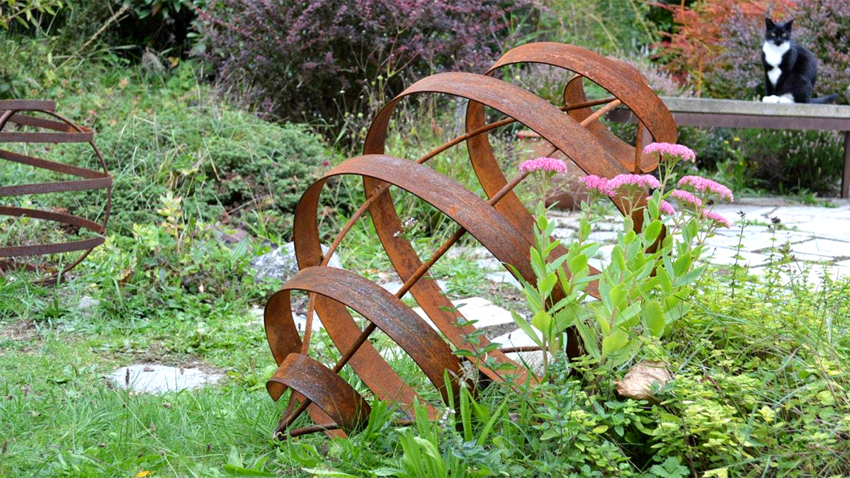 A curved rustic metal garden sculpture forms a bold focal point within a planted border, its naturally rusted surface contrasting beautifully with soft ornamental grasses and low groundcover. The simple arc shape adds sculptural interest without overpowering the planting, showing how rustic metal garden decorations can bring structure, movement, and an organic, weathered charm to garden beds and pathways – Photo: Bellewood-Gardens