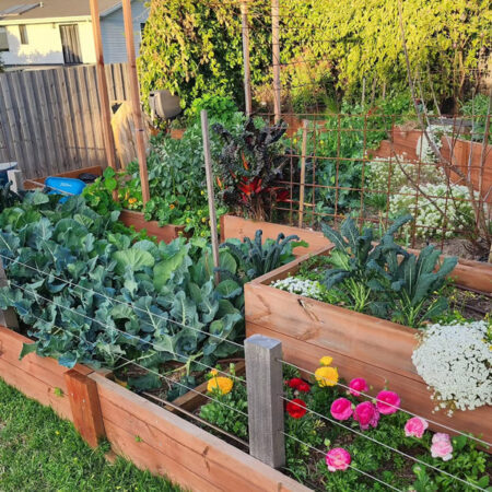 This raised vegetable garden design combines productivity with visual appeal by mixing leafy greens, climbing plants, and flowering companions. Timber beds keep the layout organised while trellises maximise vertical space and improve airflow. It’s a practical and attractive approach that works well in suburban backyards where space and structure matter – Photo: @ashs.backyardgarden